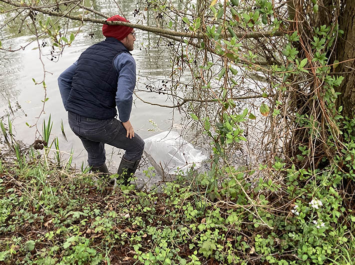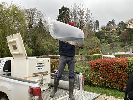 Ce sont 100 000 alevins qui ont été ainsi mis à l’eau. Ils arrivent dans 4 sacs gonflés à l’oxygène pur. Ces sacs sont d’abord posés dans l’eau jusqu’à ce qu’un équilibre thermique s’établisse. Puis ils sont ouverts et les alevins découvrent leur nouveau domaine