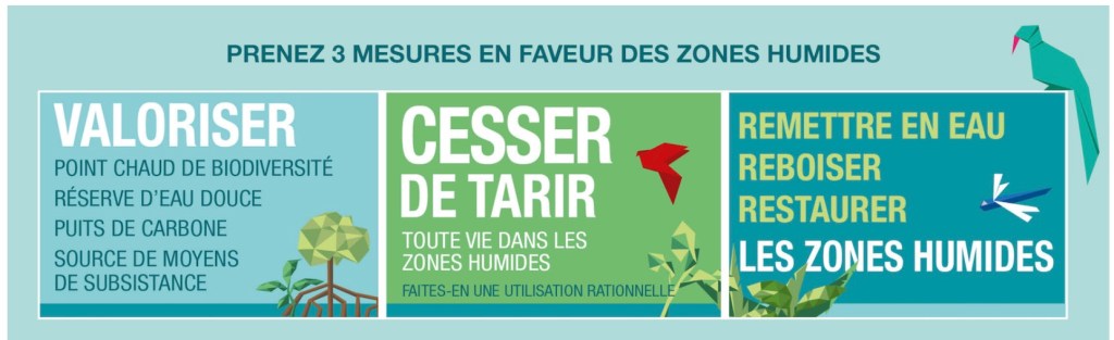 Selon les pays cette journée se situera entre le 29 janvier et le 28 février, le 2 février étant la journée commémorative de la convention de Ramsar (2/02/1971). Aujourd’hui il y a 171 pays signataires lesquels s’engagent (en principe) à protéger voire restaurer les zones humides. Mais hélas, comme souvent pour ces engagements porteurs de bons sentiments, la réalité du terrain ne correspond pas aux objectifs du traité.